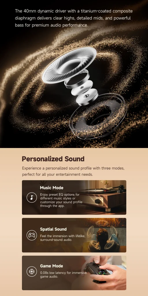 - 40mm dynamic drivers with titanium-coated composite diaphragms deliver rich, immersive audio.