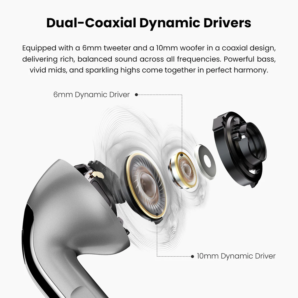 - Equipped with coaxial dual-dynamic drivers (6mm + 10mm), active crossover for a rich, expansive soundstage