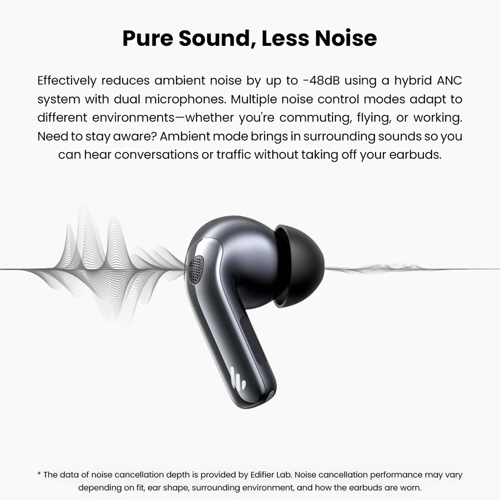 - Advanced hybrid ANC system provides up to -48dB, effectively isolating unwanted sounds