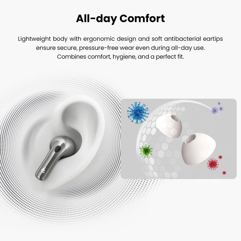 - Soft, secure and hygienic antibacterial ear tips for all-day comfort