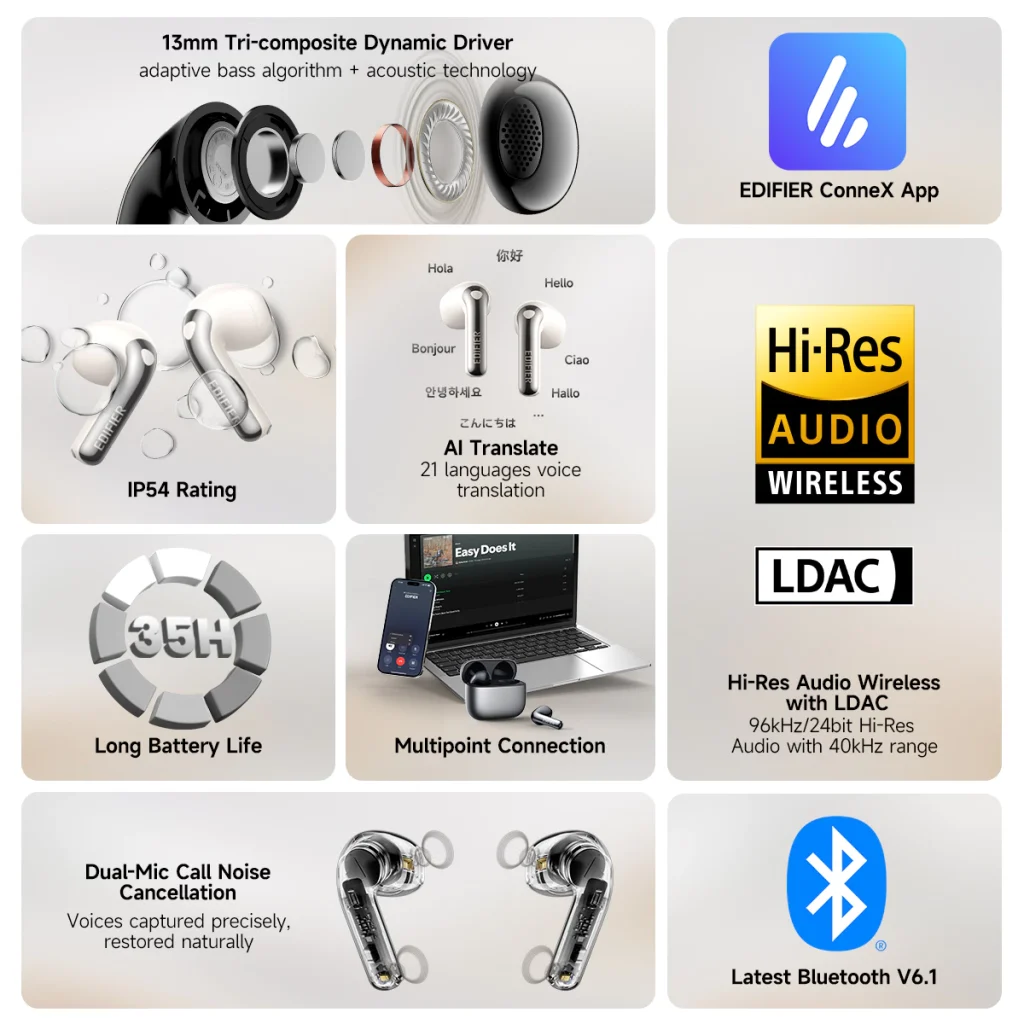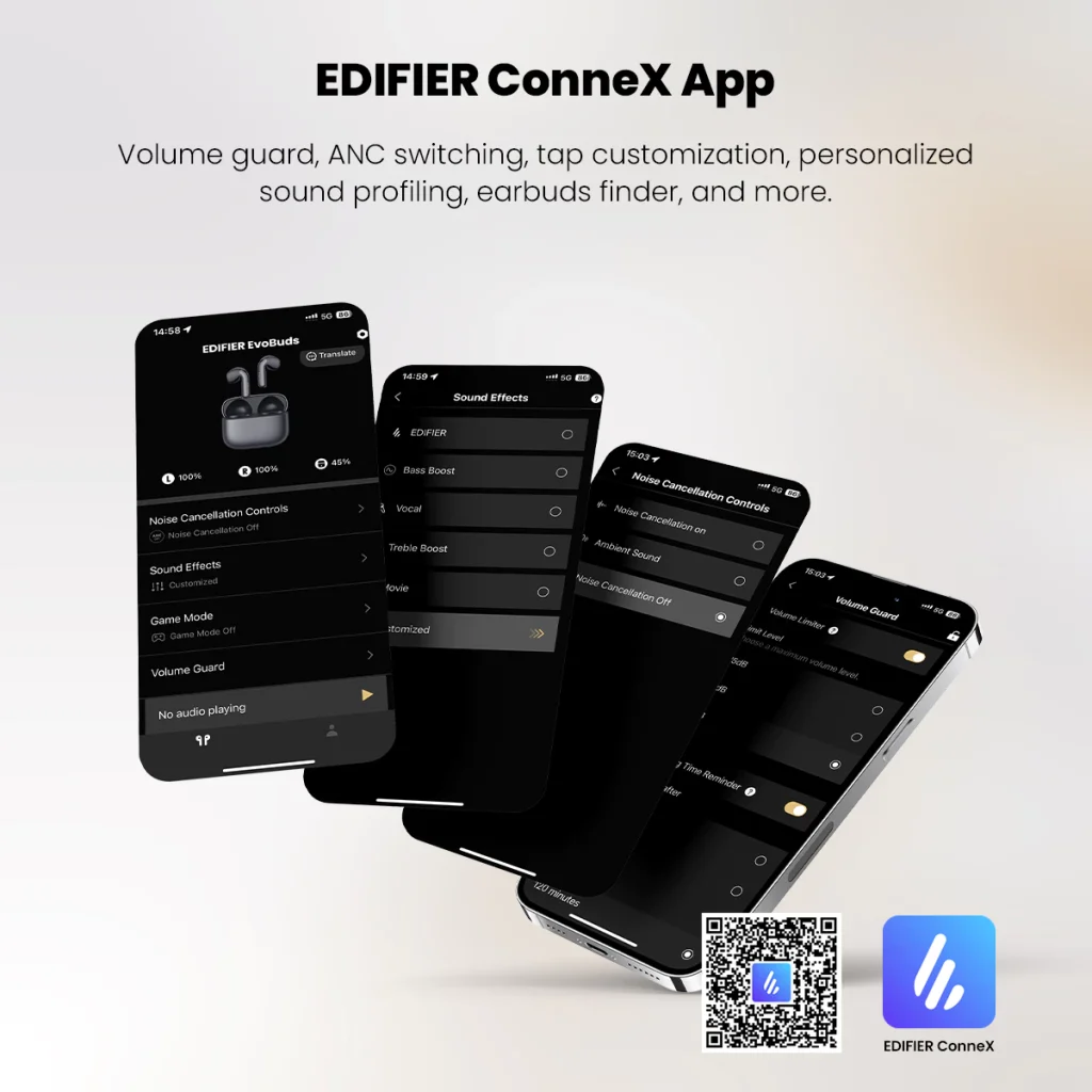 - Compatible with EDIFIER ConneX App for additional functions:customizable EQ, personalize control settings, find your earbuds, and more.