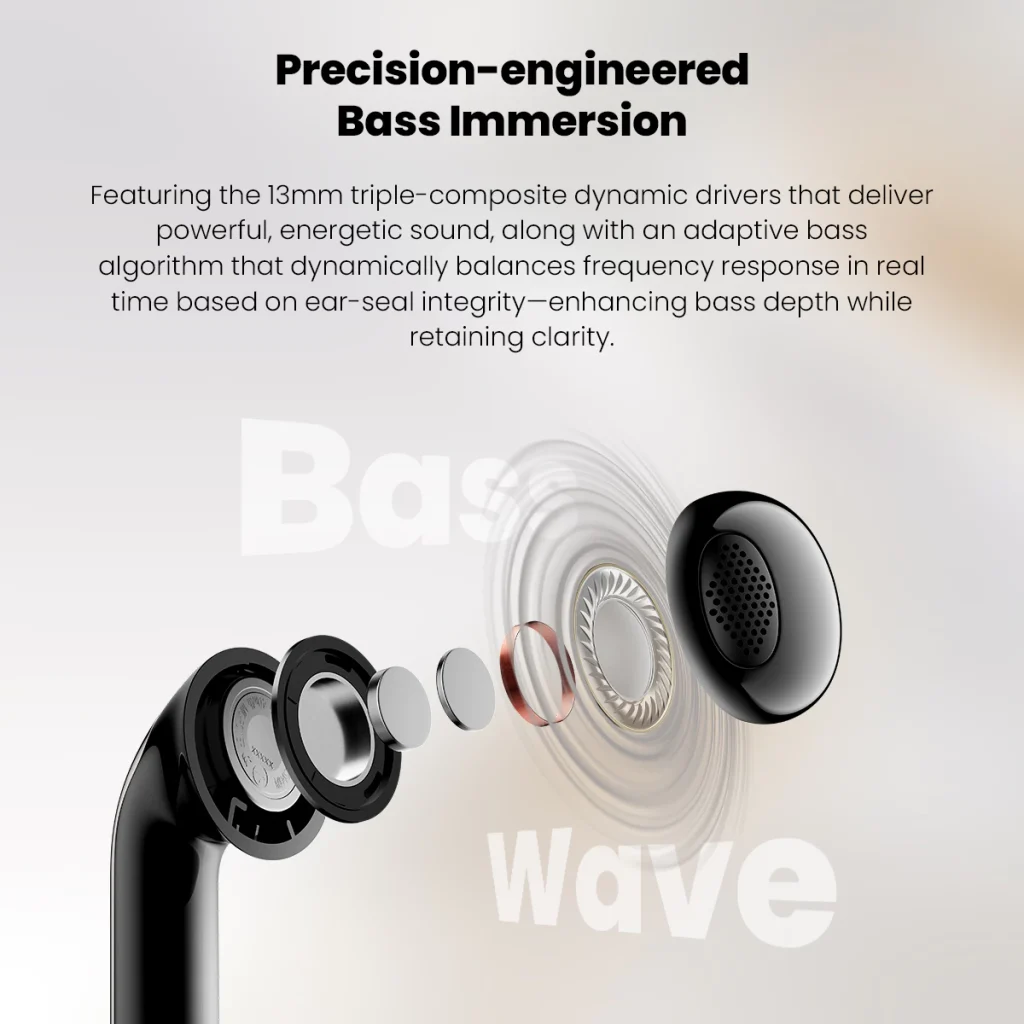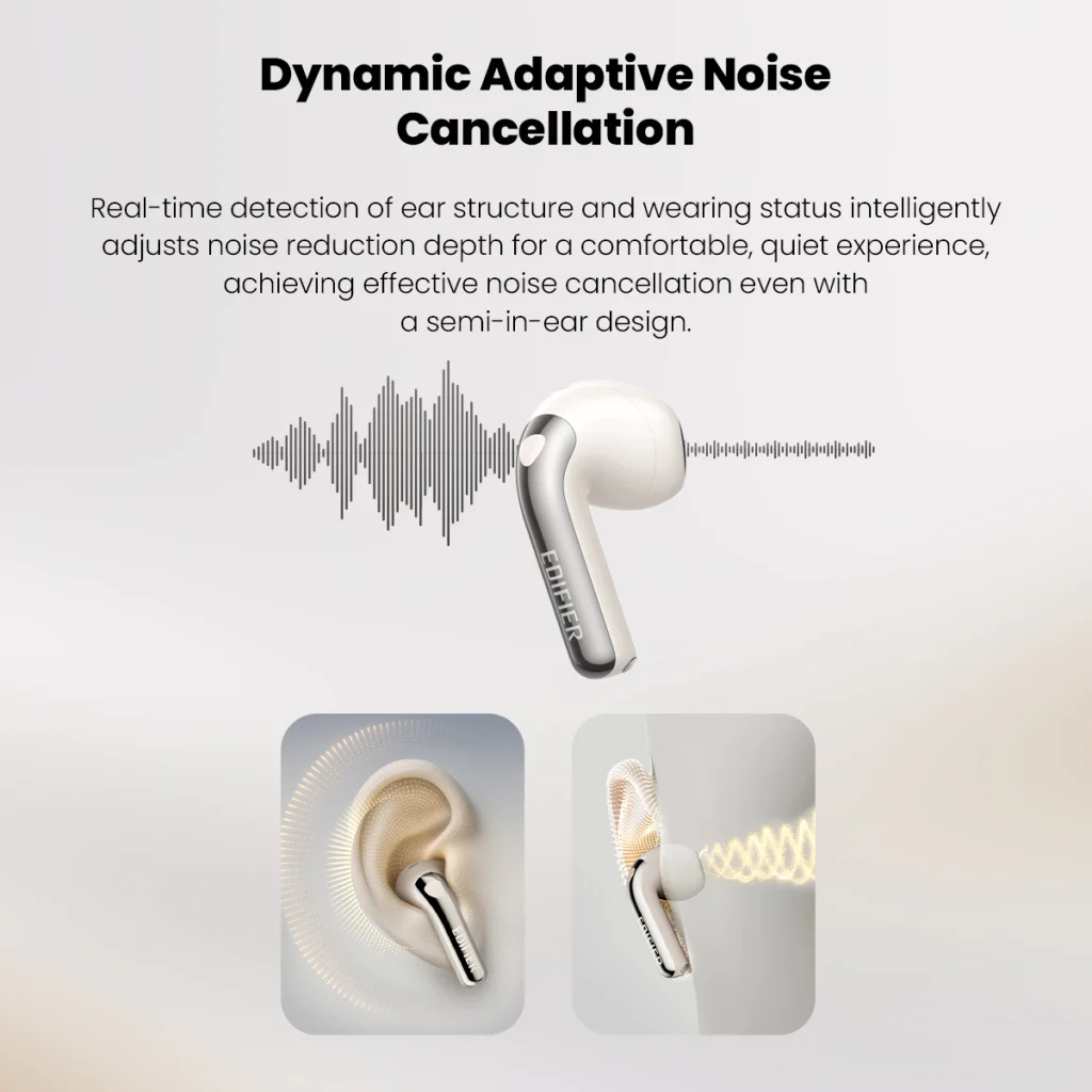 - Adaptive ANC adjusts to reduce ambient noise in real time