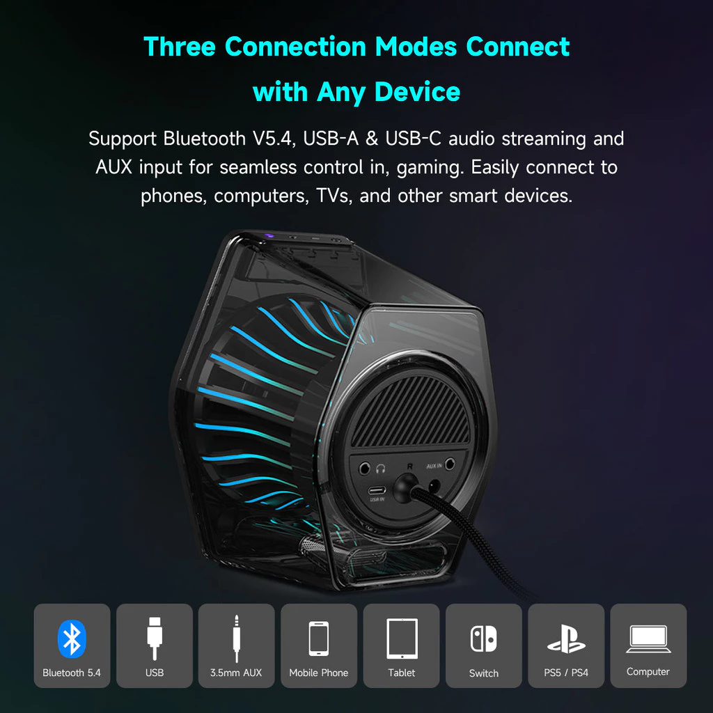 • Supports Bluetooth, USB-A, USB-C, and AUX input for seamless audio streaming from multiple sources