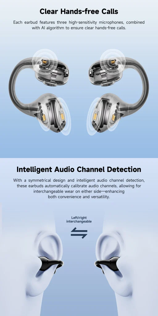 - Intelligent audio channel detection enables interchangeable wear on either side
