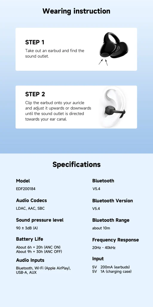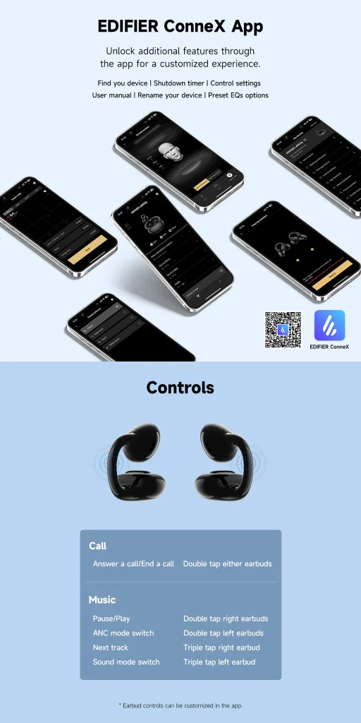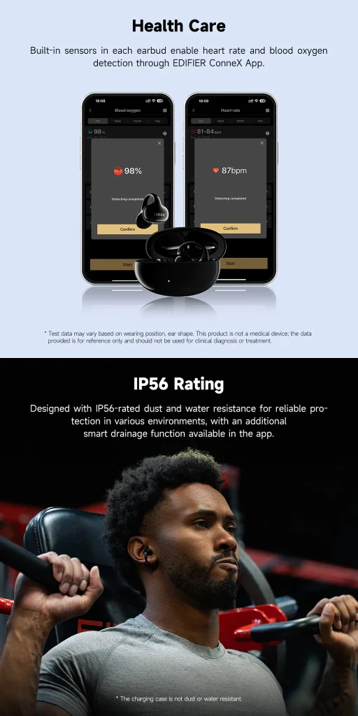 - Compatible with the EDIFIER ConneX App for additional functions: heart rate and blood oxygen detection, drainage function, personalize control settings, and more