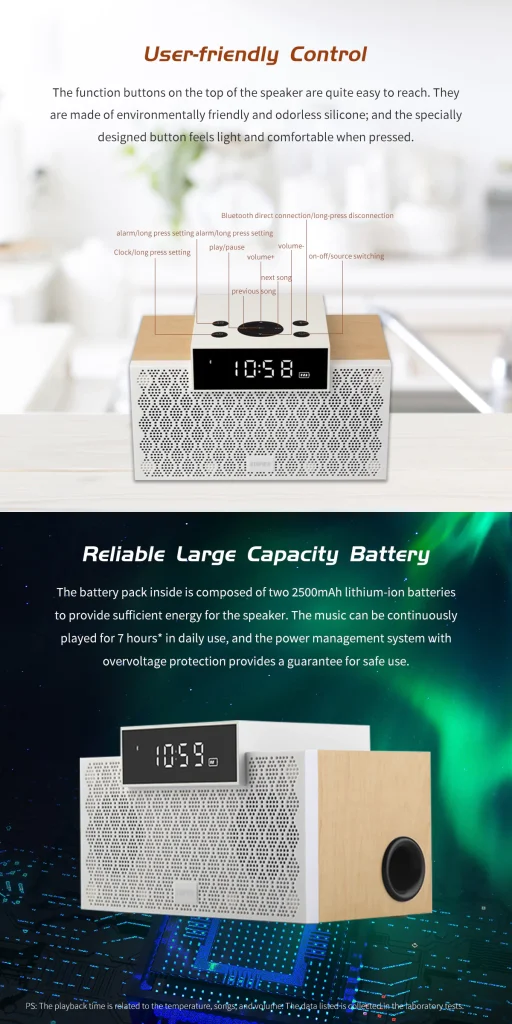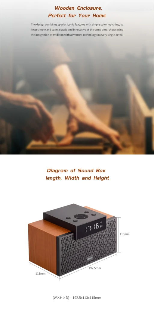 - Versatile function: Clock, Alarm; AUX, USB and micro SD inputs