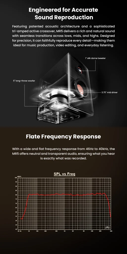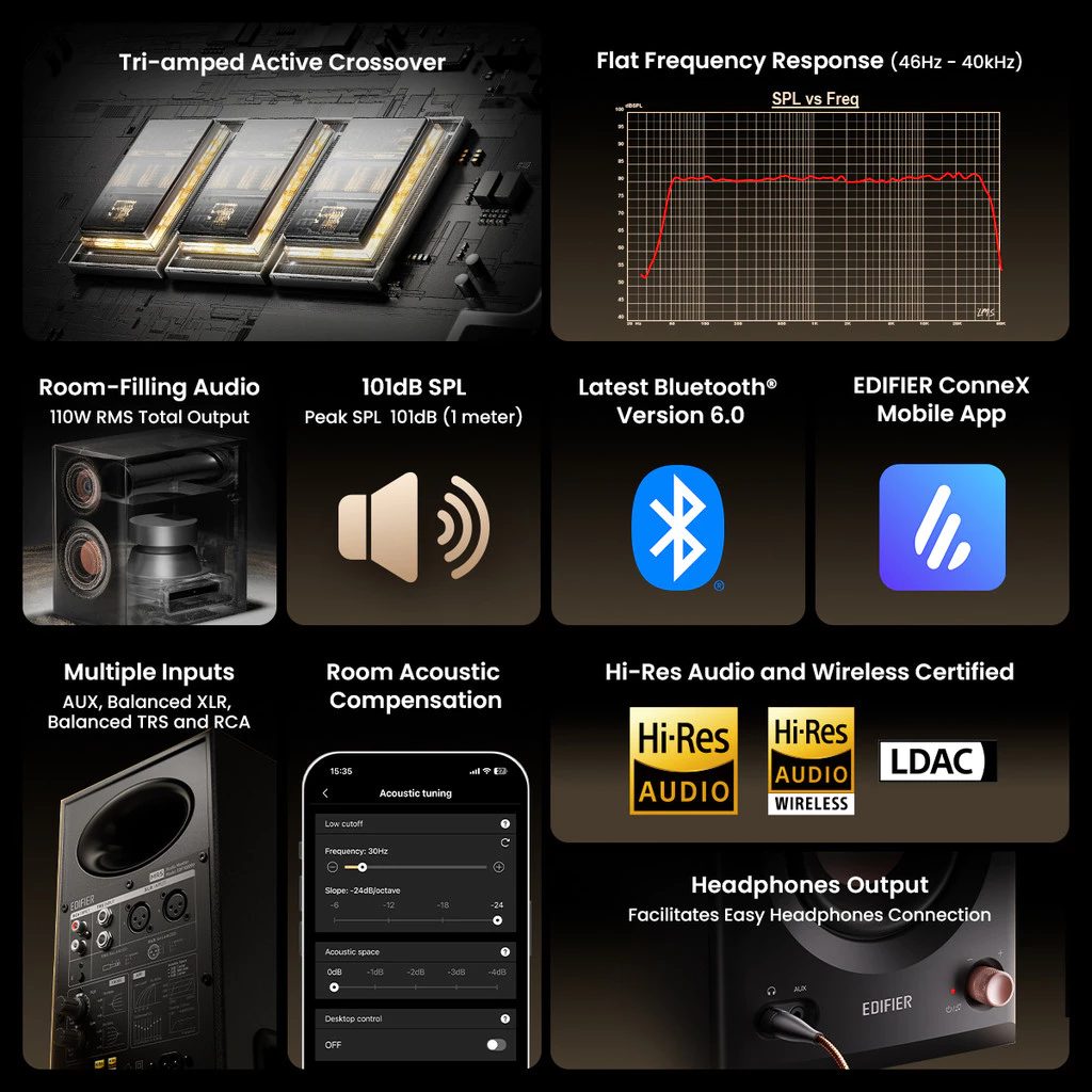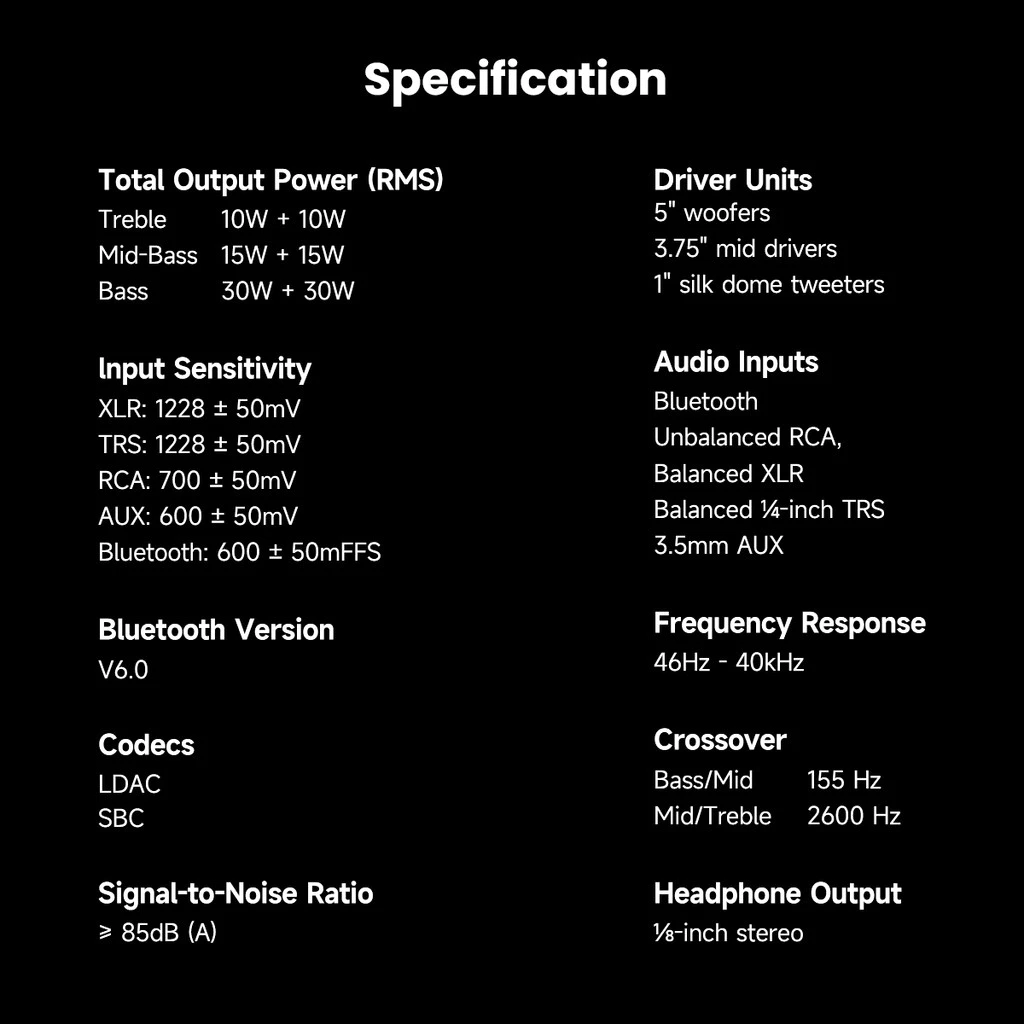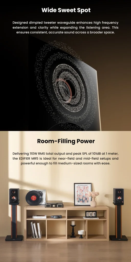 - Delivering 110W RMS total output power and SPL up to 101dB (at 1m), suitable for near-field listening and also powerful enough to fill a normal living room