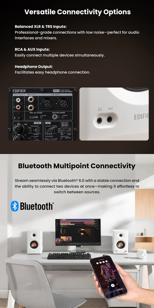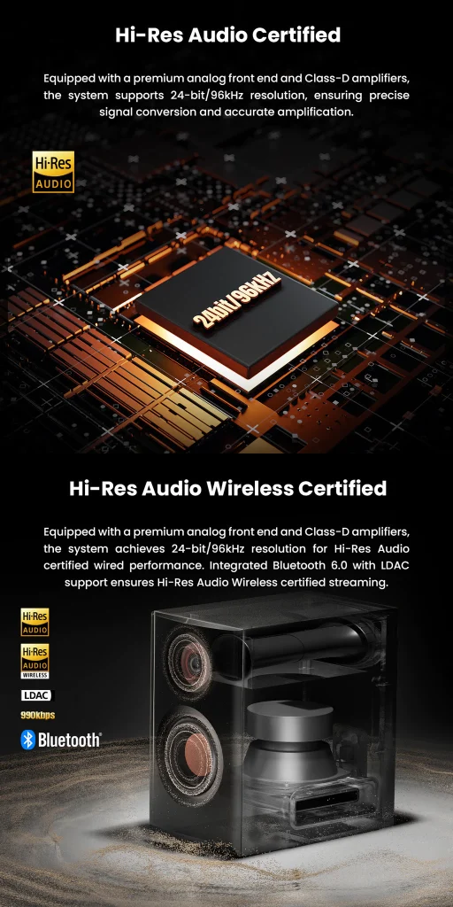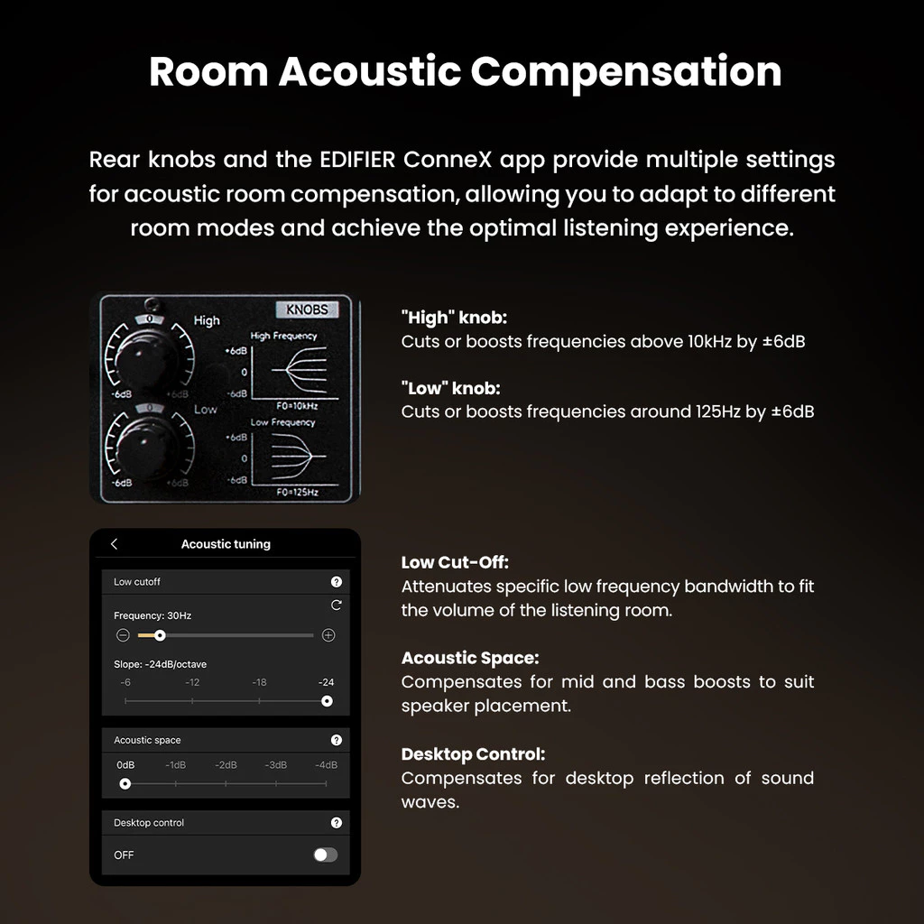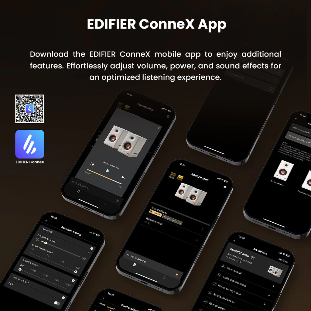 - Works with EDIFIER ConneX Mobile app for sound effect switch, EQ customization, room acoustic compensation settings, user manual and etc