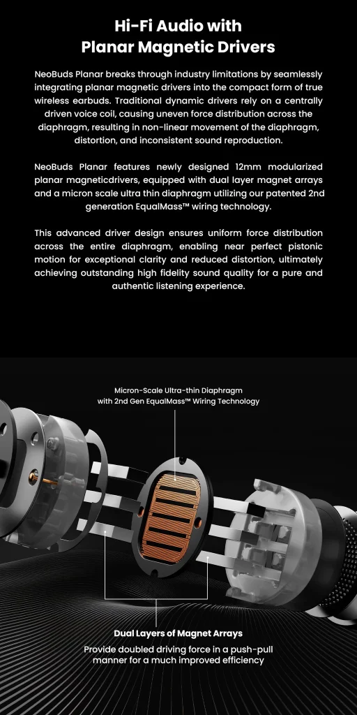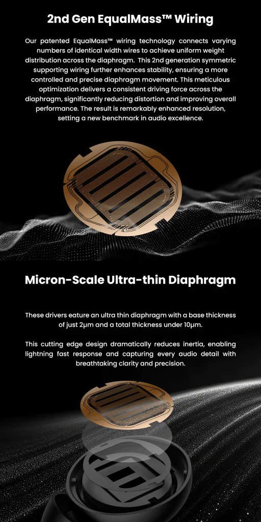 - 2nd Gen EqualMass™ Patented Wiring Technology: Paired with a micron-scale diaphragm, ensures exceptional transient response and low distortion