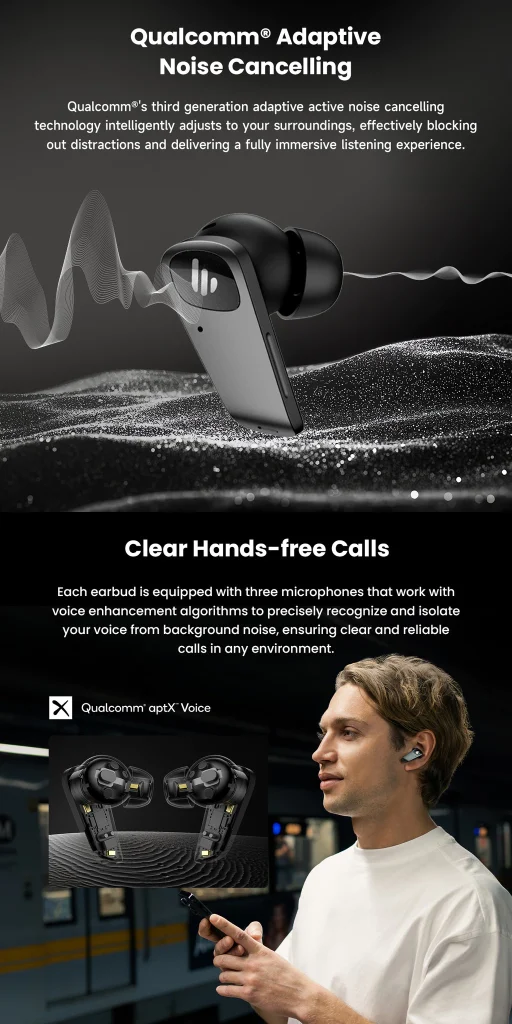 - Qualcomm® Adaptive Noise Cancelling: Intelligently adapts to the environment for a serene listening experience