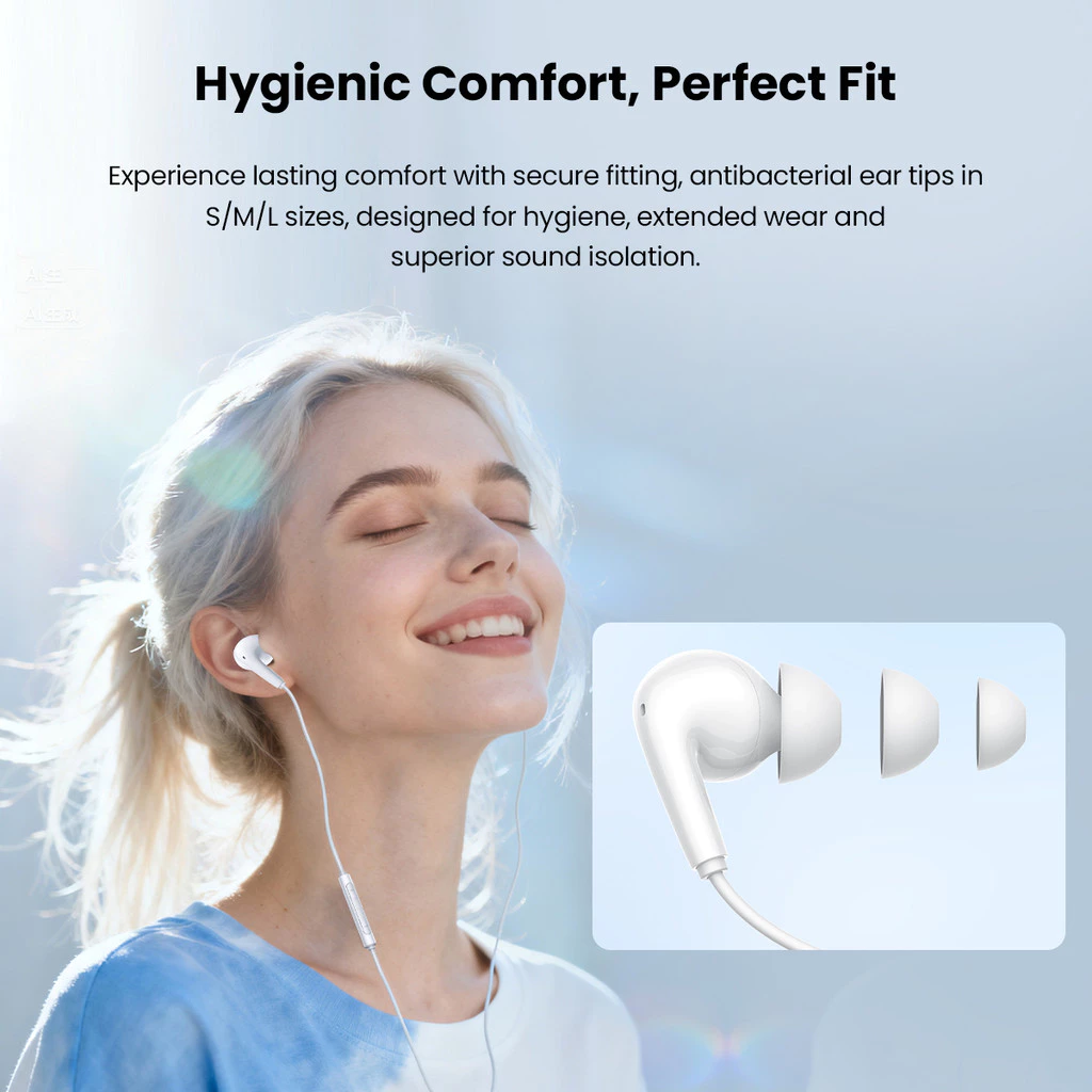 - Antibacterial ear tips in three sizes provide lasting comfort and a secure fit