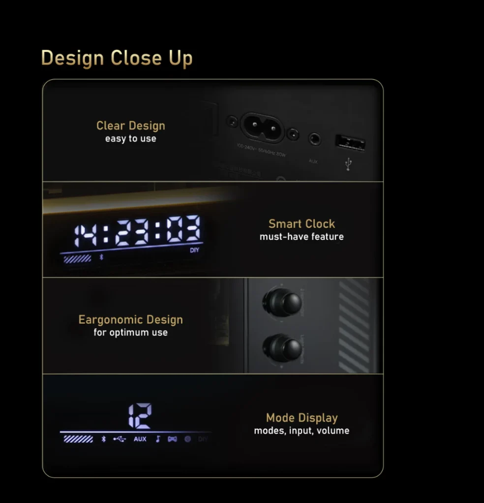 - Support Bluetooth, USB-A, Aux-in input