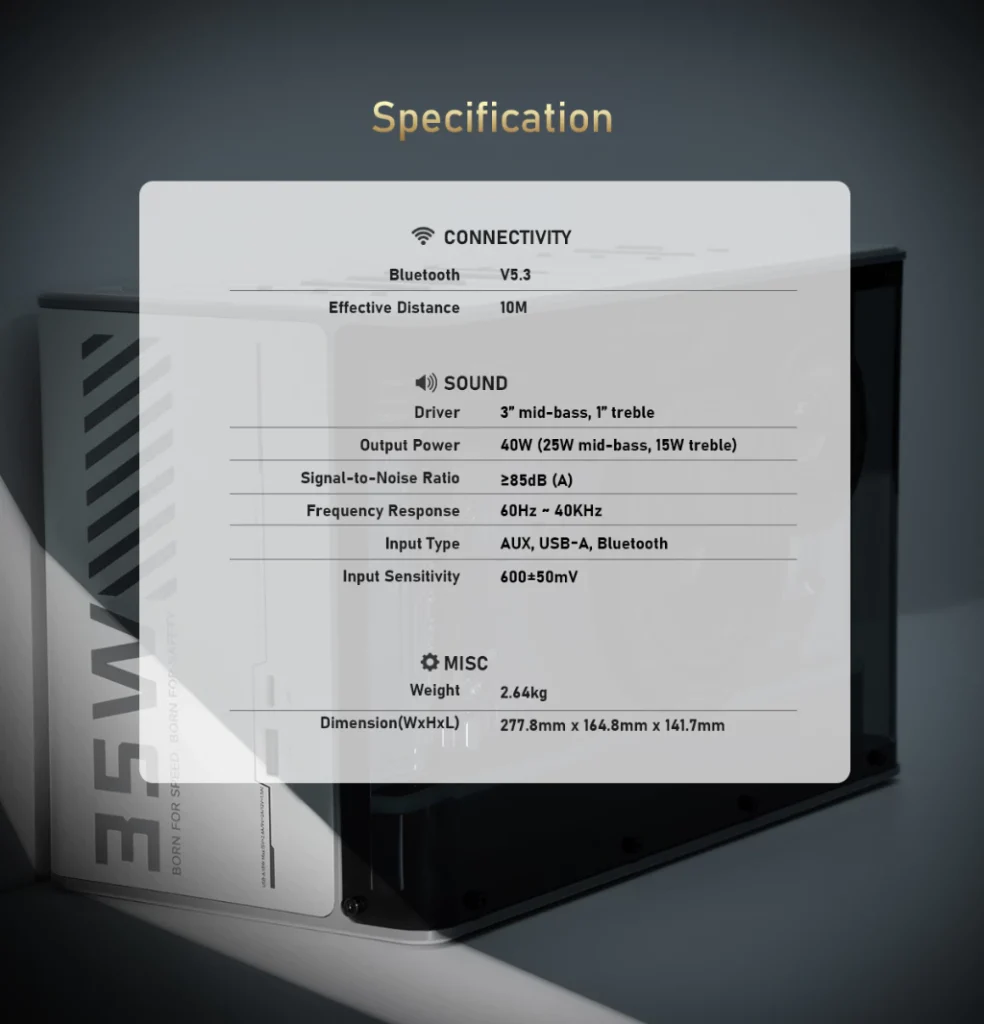 - 3″ mid-bass and 1″ tweeter driver with Total 40W RMS